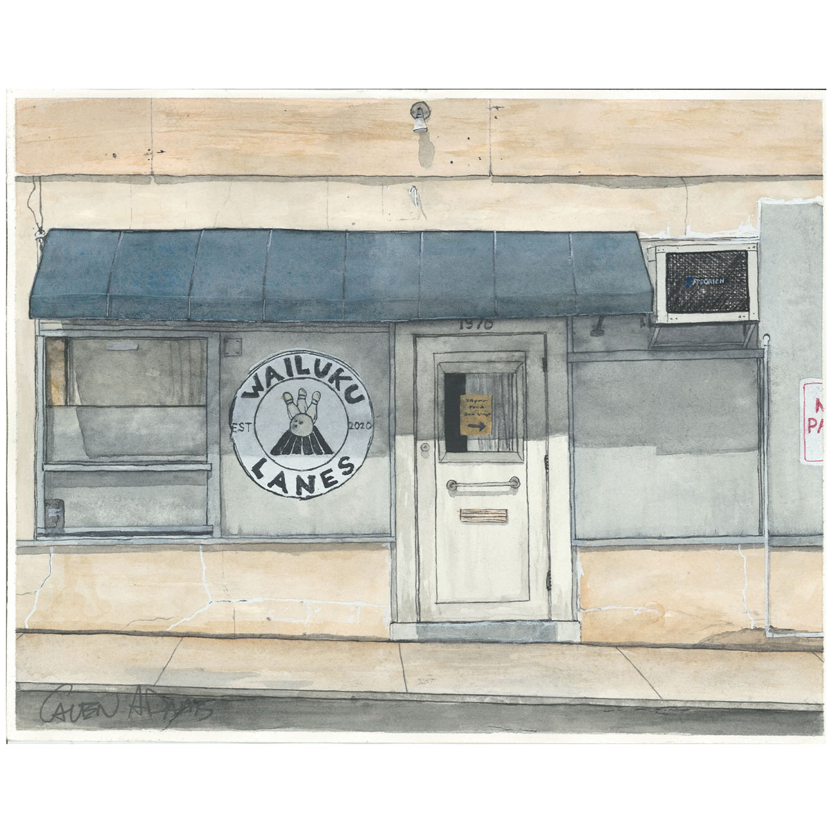 Watercolor painting of 1976 E. Vineyard St – “Wailuku Lanes” bowling. Signed watercolor paper prints are available in four sizes and come ready to frame. They are printed in Hawaii and include free shipping. Please note that other printing options are available; just reach out to Calen for larger sizes and different printing options.
