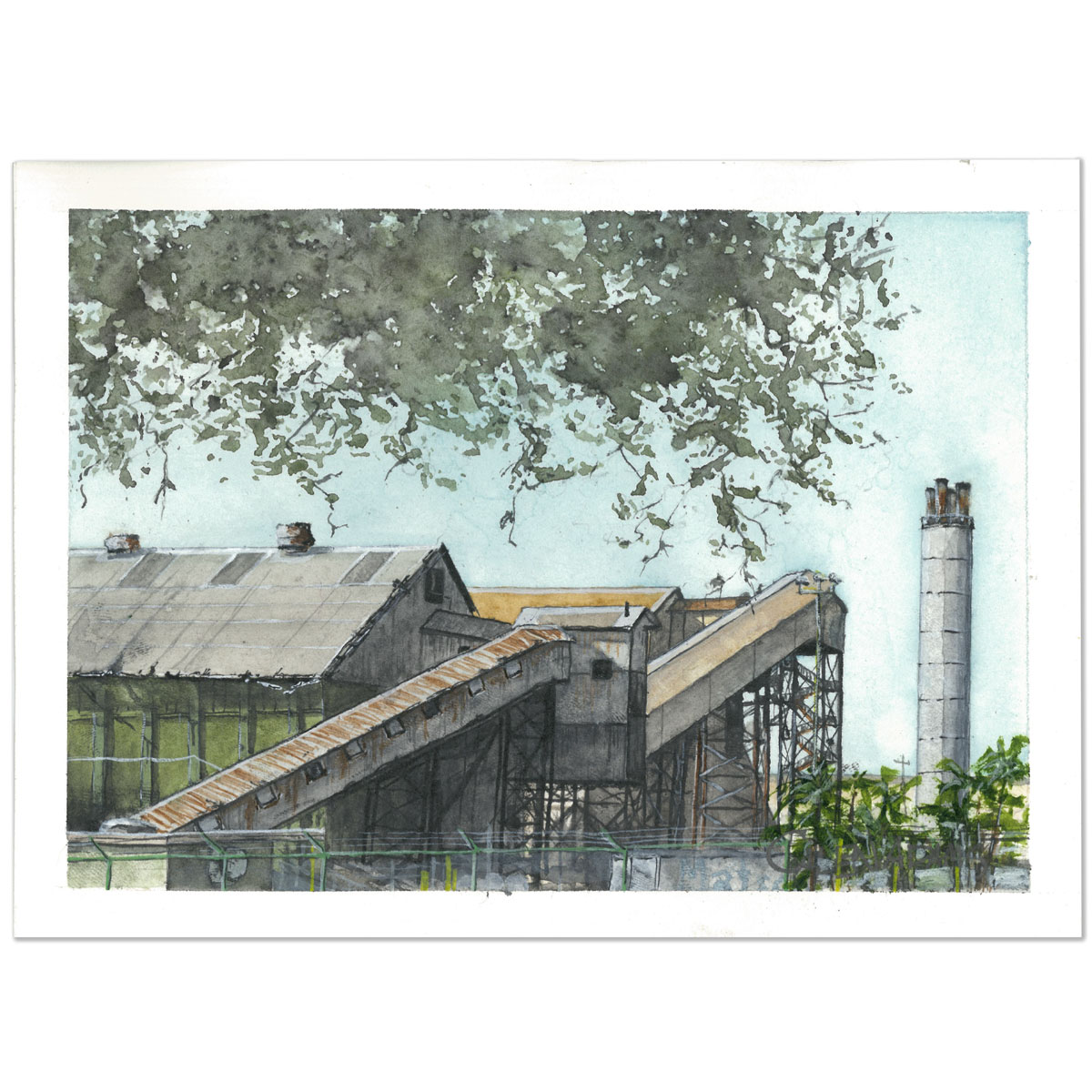 Watercolor painting of Kahului Industrial in Maui, Hawaii. Signed watercolor paper prints are available in three sizes and come ready to frame. They are printed in Hawaii and include free shipping. Please note that other printing options are available; just reach out to Calen for larger sizes and different printing options.